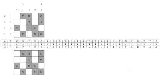 根据数图原理 先把11个字母解出来 这点玩过数图的解题相对容易些 原理就是同行或同列 根据数字的个数选择对应相连数的字母 如果有两个数中间是有间隔字母的 这样解除来从左至右 从上到下顺序依次是:F M W V I T I L F M W(具体可以自己试着解一下)