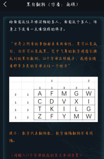 “世界上所有的事物都具有两面性,黑可以变成白,白亦可以变成黑,空中飞舞的数字将指引横或列的黑白颠倒,26个字母在照镜子,我将会随着那串另类的字母去往一个地方”