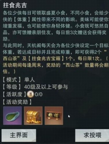 立夏集期间,天机阁为各位少侠准备了丰盛的立夏小食,不同小食会给少侠的体重带来不同的影响。少侠也可大展厨艺,自行合成小食,并有机会做出独一份的【泻药】。小食既可悠然自品,亦可馈赠亲朋佳友。