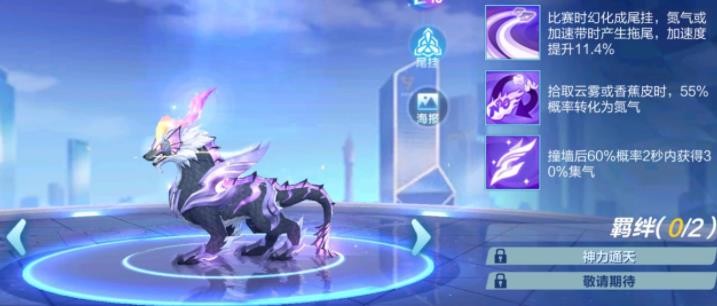 3. 先来看一下,避水金晴兽的作妖属性,其技能三是撞墙后额外获取集气,概率和增加的幅度都一般,其竞技属性是可以忽略的,不过它强的地方在于第二技能,在获取云雾以及香蕉皮道具时有概率转换为氮气,基础概率55%,和小白龙搭配羁绊可以额外获取7%的技能二概率。