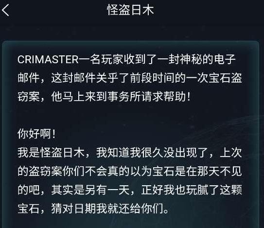 我是怪盗日木,我知道我很久没出现了,上次的盗窃案你们不会真的以为宝石是在那天不见的吧,其实是另有一天,正好我也玩腻了这颗宝石,猜对日期我就还给你们。