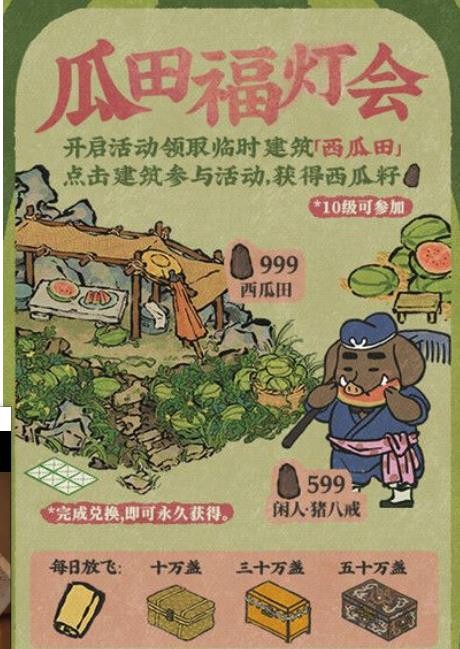 【瓜田福灯会】活动开启!活动开启后领取临时建筑【西瓜田】,点击建筑参与活动获取道具【西瓜籽】(游戏等级需≥10级),收集一定数量西瓜籽即可永久兑换建筑【西瓜田】、闲人【猪八戒】。每周五/周六/周日放飞数量达到十万、三十万、五十万时,即可在活动界面领取额外奖励。
