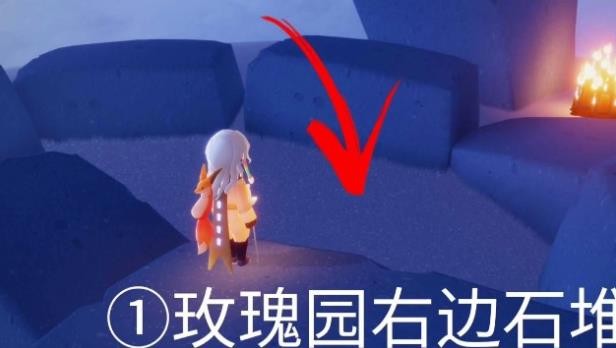 小王子第一次藏在玫瑰庄园右边的石堆旁边,具体位置可以参考图片: