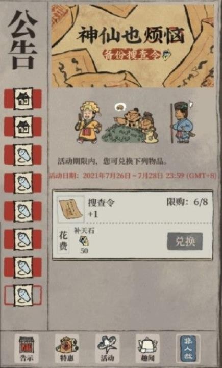 2、如上图所示位置,大家进入神仙也烦恼限时活动中后,左边最下面一个就是兑换备份搜查令地方,兑换一个需要50个补天石,而且限购8个哦。