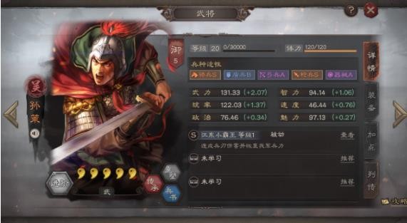 武将属性:孙策在属性方面倒是非常的完美均衡,就连智力也不会太低,这或许是孙策这一武将唯一的优点了,即使在拥有均衡面板的情况下,孙策的强度还是远远不够的。