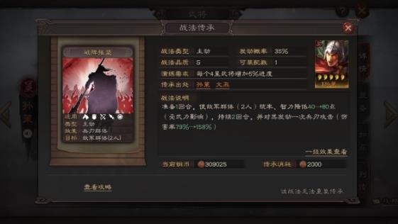 战法描述:战斗中,普通攻击后有35%几率对目标再次发起猛攻(伤害率96%-192%)并为我军单体恢复兵力(治疗率28%-56%,受武力影响);自身为主将时,战斗前2回合,使敌军单体首次受到伤害提高15-30%