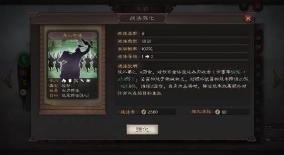 战法描述:使自己武力提升25(50)点,并获得群攻(普通攻击时对目标同部队其他武将造成伤害)效果(伤害率35%-70%),持续2回合。