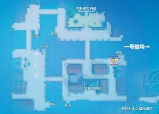 需要玩家打开地图,选择七水之城,然后选择造船岛中心街,来到这个地图的右边区域,就是在一号船坞这个码头这里,具体的位置大家可以参考图中所示的地方。