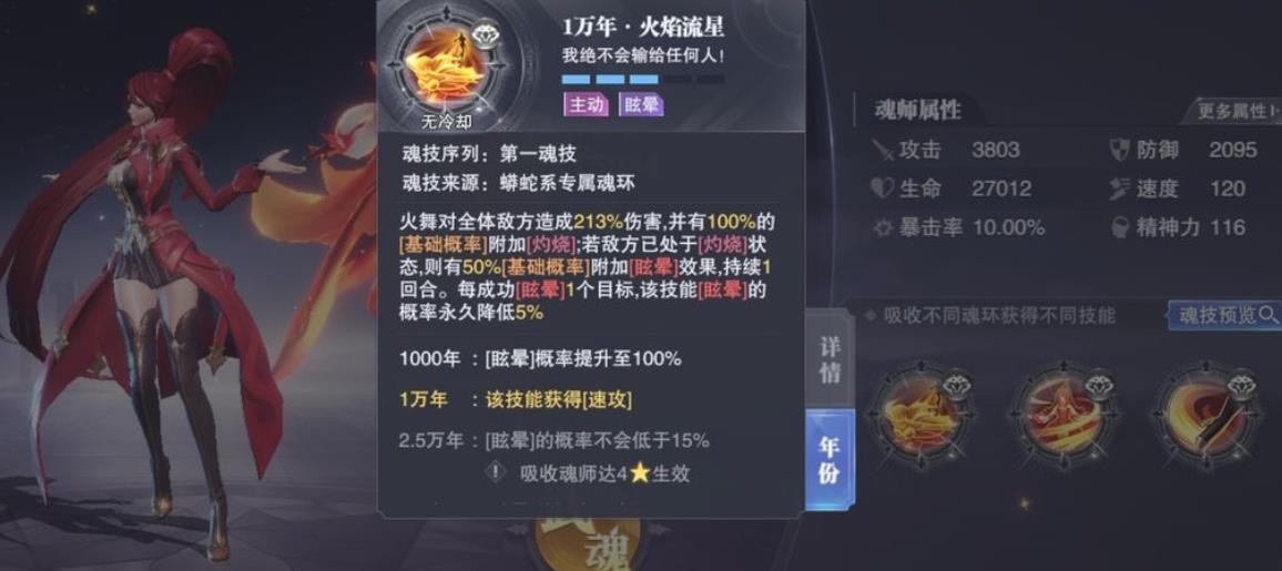 2、第一手万年魂环优先选择蟒蛇系给火舞用,速攻起手二火直接眩晕敌方全体,是前期过度的最佳之选。