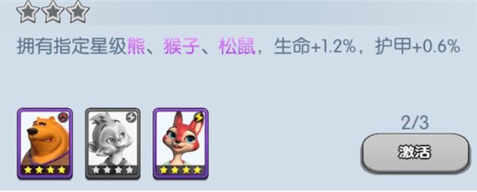 拥有指定星级熊、猴子、松鼠,生命+1.2%,护甲+0.6%