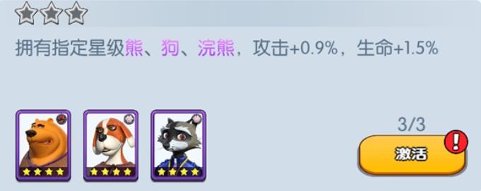 拥有指定星级熊、狗、浣熊,攻击+0.9%,生命+1.5%