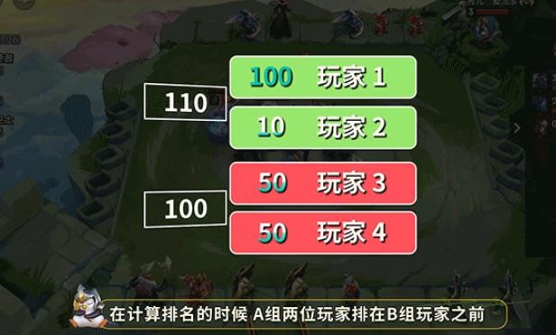 在计算排名的时候,A组两位玩家排在B组玩家之前,选秀时B组玩家将优先行动,这样一来只有10点血的玩家2,更难拿到自己想要的装备。在游戏过程中,需要沟通好己方的游戏策略才行。