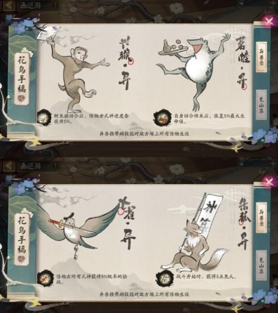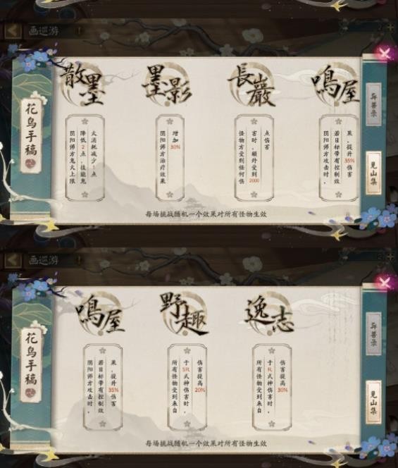 挑战前大人从系统提供的式神中进行选择,共5轮,每轮4个式神。「画灵」携带不同的技能,「画灵」技能对随「画灵」上阵的式神生效,可前往「花鸟手稿」-「异兽录」查看。