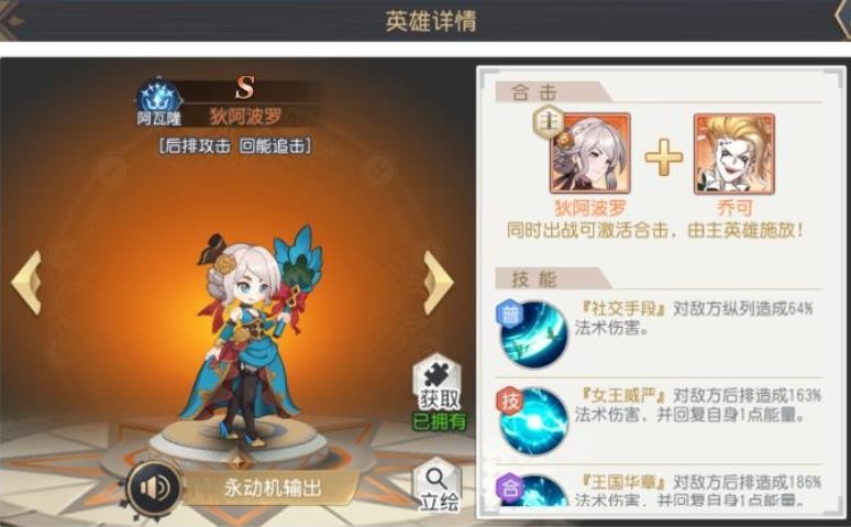 阿瓦隆阵营中非常强力的输出型英雄,全体攻击的技能能够压低对面血线甚至直接秒杀对面,因此可进行重点培养,其后期输出不容小觑。