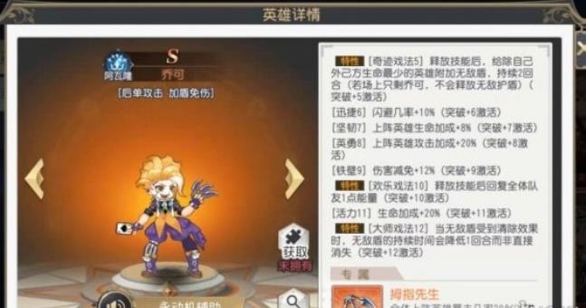 某种意义而言,乔可是阿瓦隆阵容中最完美的的辅助,不仅拥有全体回能的特性,并且还能协助收割后排(后排单体特攻),除此以外乔可专属武器+25还能为上阵英雄提供20%暴击几率的增益光环,在突破+5的时候就可以为一位队友附加两回合的无敌盾,在前期无敌盾较难清除、大家战力都差不多的情况下,一个无敌盾就能很好的打乱对方节奏,是越级爱好者们居家必备的良友。