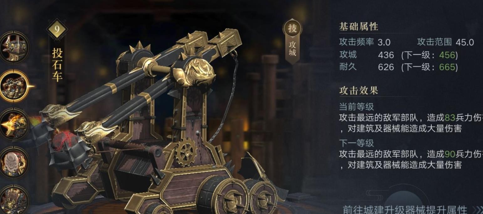 在游戏中,不管是基础还是成长上,投石车的攻城值都是最高的。所以在配置队伍的时候,我们首选投石车作为首发队伍的器械配置。