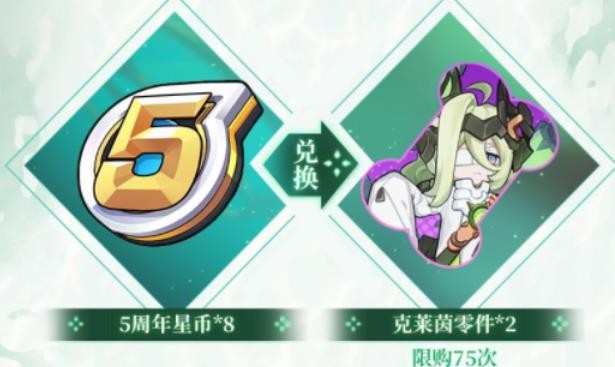 参与周年累消活动,获取5周年星币,可在星币商店兑换「克莱茵零件」*150,解锁武装人偶「克莱茵」。