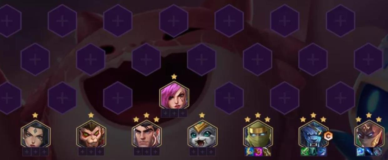 阵容组成:西斗之飒(豹女)、未来守护者(杰斯)、海上幽影(派克)、影疾忍(劫)、皮城执法官(蔚)、齐天大圣、狻猊之心、北境之傲(狮子狗)
