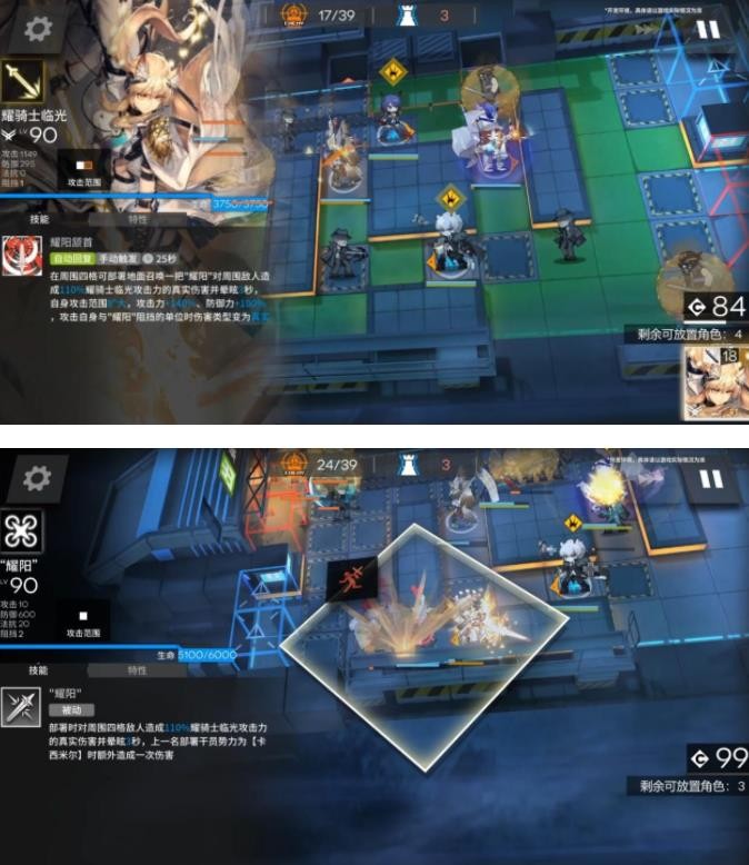 在周围四格可部署地面召唤一把“耀阳”,对周围敌人造成一定比例耀骑士临光攻击力的真实伤害并晕眩数秒;