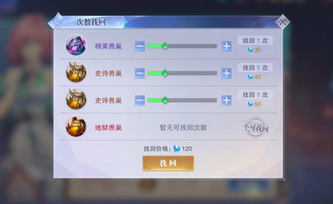 注意:找回系统是只能找回5日内的次数如果你想周日用双倍卡的话那就从周二一直屯到周六。这样刚好五天可以屯各个巢穴五次