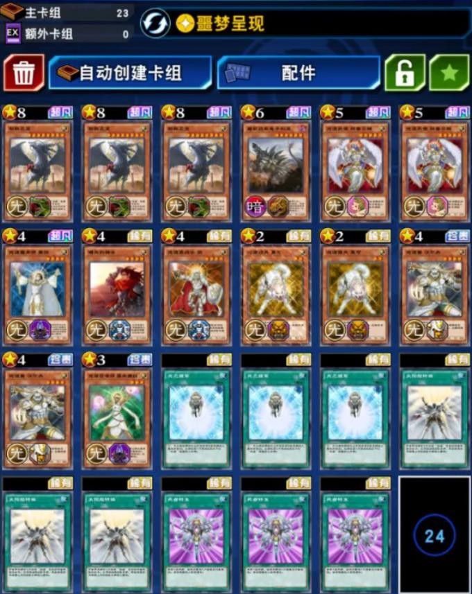 最后一张是曙光骑士,这张卡是防止卡组疲劳的妥协,堆到的情况可以把墓地的怪兽回卡组,盖在场上也能辅助堆一个光道,我们的卡组23张相对于更厚的光道来说,关键魔法卡的上手率高了不少,算上技能和曙光骑士实际卡组有25张,太阳能转换、光之援军、大天使等卡都是堆4,25卡后攻抽完牌卡组还有20张,4的倍数可以保证能发出大天使的堆墓炸卡效果,那再多有没有意义呢?有也没有,因为如果跳裁决龙没斩杀的话卡组要多五张才够。