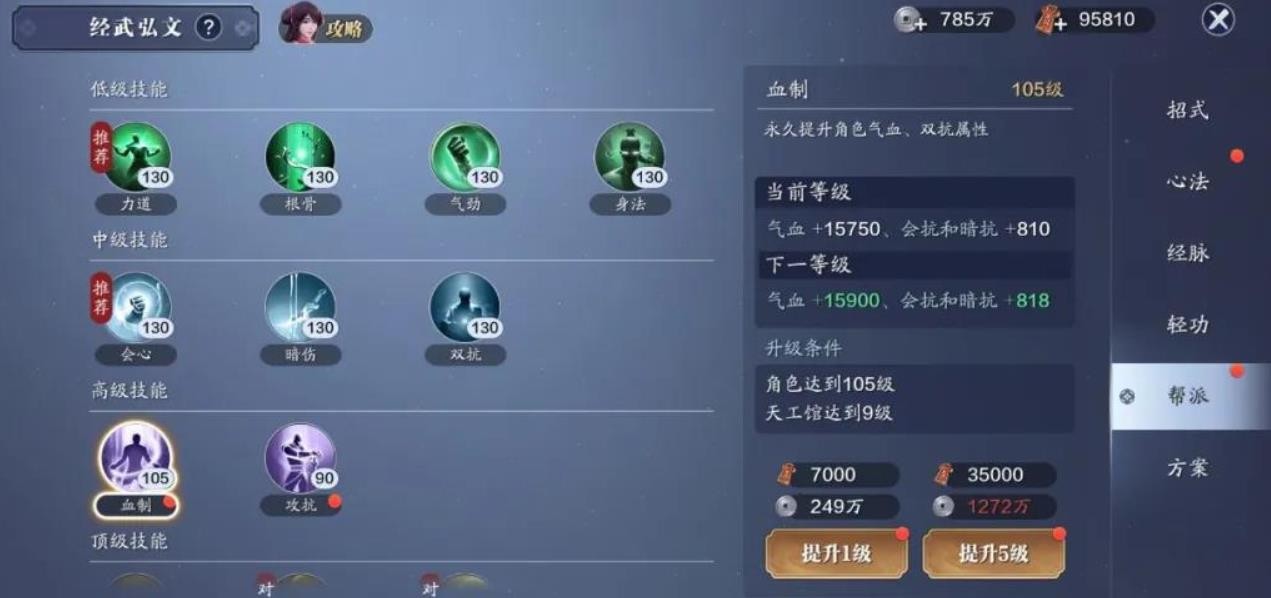 105级开放高级技能血制100~110级。总共需要69250帮贡和2482W的碎银,提供248点功力。属实不想点,比较推荐补齐四维80以及破拆120级。破拆120级以后性价比也降低了,特别是130级之后,需要更多的材料,还只提升8点数值,