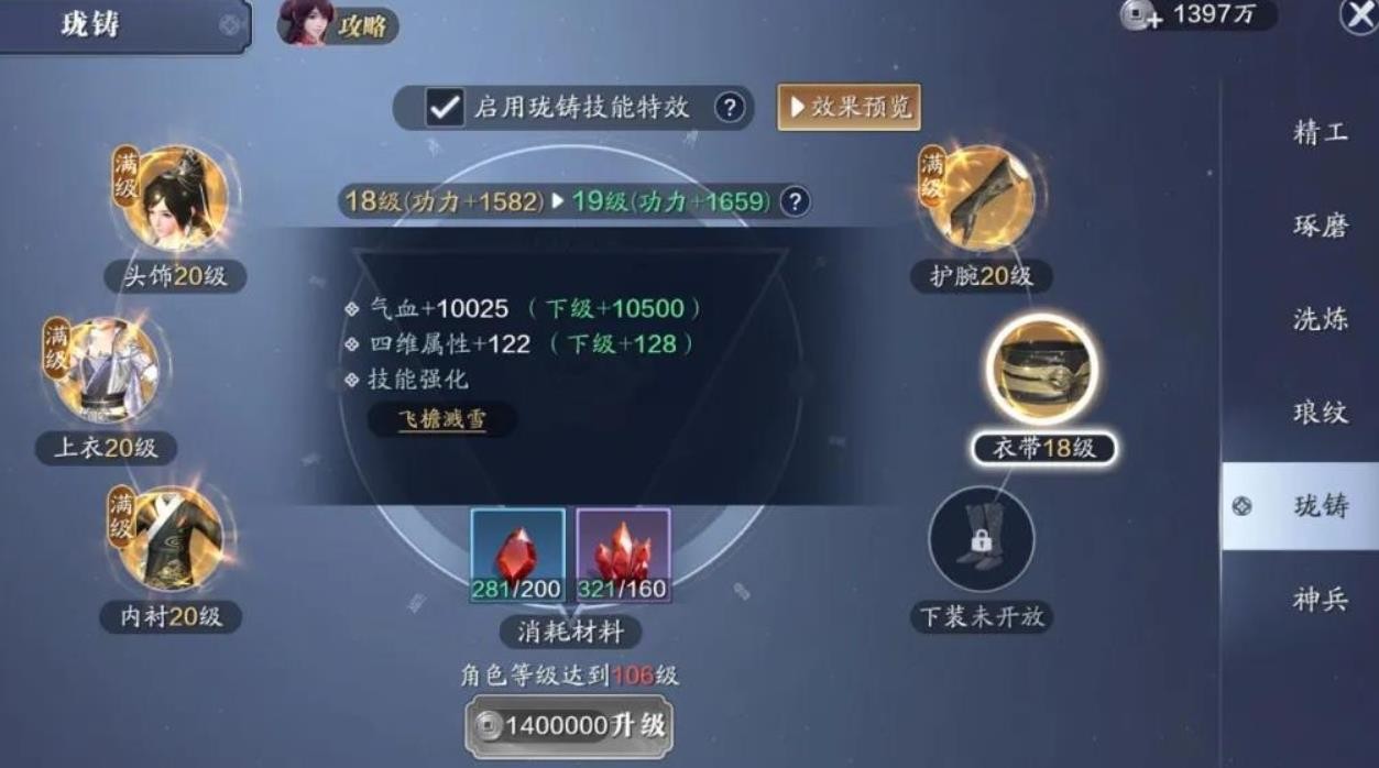105级开放衣带珑铸15~18级。总共需要600个冶玲珑·初,150个珑铸材料,470个深以及360W碎银,提升299点功力。估计是一级也升不了,初和珑铸材料是真的缺。106级再开放到20级解锁特效。