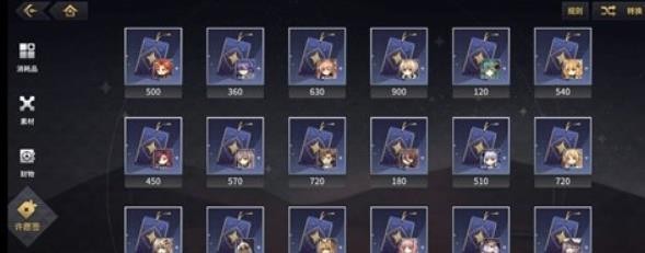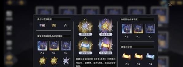 重复获得相同的角色即可获得许愿签,如果获得相同SSR角色、SR角色可获得粹银星徽与耀金星徽。每个图案倍镜颜色代表不同稀有度的许愿签,许愿签又可以转换获得百梦轴线与千念万轴线,这两样道具可在【商会-稀有】中的【轴线兑换】粹银星徽与耀金星徽;而粹银星徽与耀金星徽在【商会-稀有】中兑换共鸣回响、虚体数、星导之愿以及回忆之证等物品,与尼奥德的作用相等。