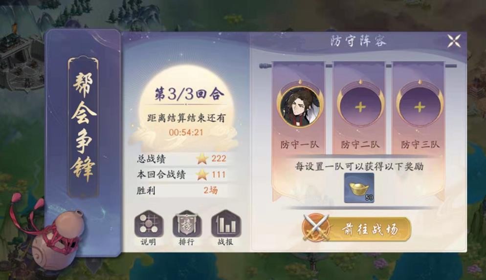 2、帮会参与帮会战后,将有默认90支NPC队伍参与防守,帮会成员可以设置防守队伍替换一个NPC队伍参与防御,每个成员最多可设置三个防守队伍。