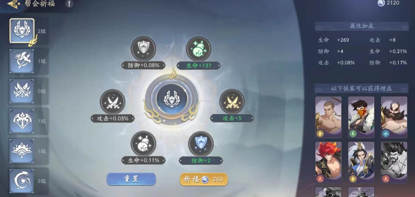 1、祈福点:祈福点可以使相关特定侠客获得属性加成,等级越高,属性加成也就越高,后期提升的战力非常明显。相对于每日的点卯奖励,帮会战可以获得更多的祈福点,快速提升实力。
