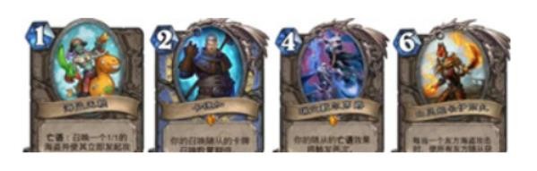 这套阵容的特点就是利用无赖海盗的亡语的先攻特性外加上卡德加、瑞文的效果不断的制造小海盗最后就是再由舰长的效果不断让整个阵容群体加攻制造场面的膨胀。值得一提的是小海盗的身材是会不断继承前一个小海盗的身材的。