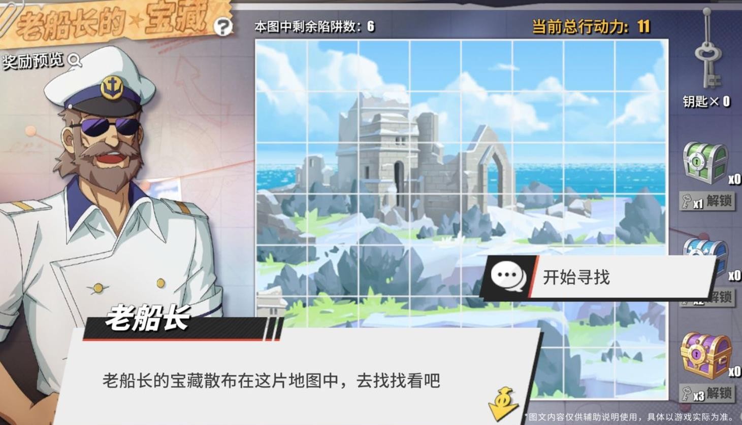 2.船长们每日参与活动、完成日常任务可以获得行动力,消耗行动力点击方格可以进行探索。
