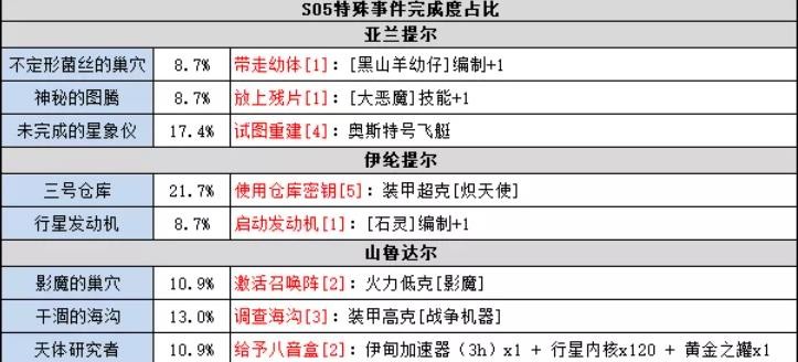 举个例子: 表里有三号仓库事件,说明这个事件是会影响到S05进度100%的特殊事件。