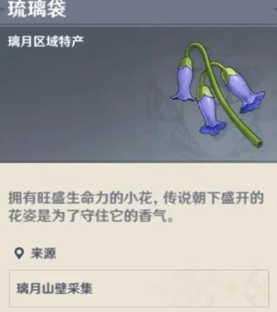 琉璃袋,七七的突破材料之一,在茫茫地图 上显得格外的稀少, 主要生长在璃月地区,拥有旺盛生命力的小花,传说朝下盛开的花姿是为了守住它的香气。