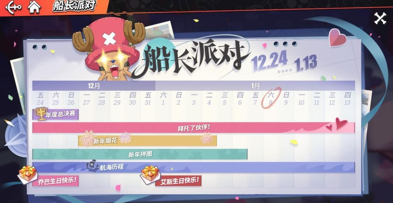 航海王热血航线船长派对活动怎么玩?船长派对活动有哪些?航海王热血航线跨年活动船长派对即将上线了,想知道船长排队活动的上线时间吗,想知道船长排队的活动都有什么内容吗,下面一起来了解一下航海王热血航线船长派对活动玩法介绍,感兴趣的玩家不要错过。