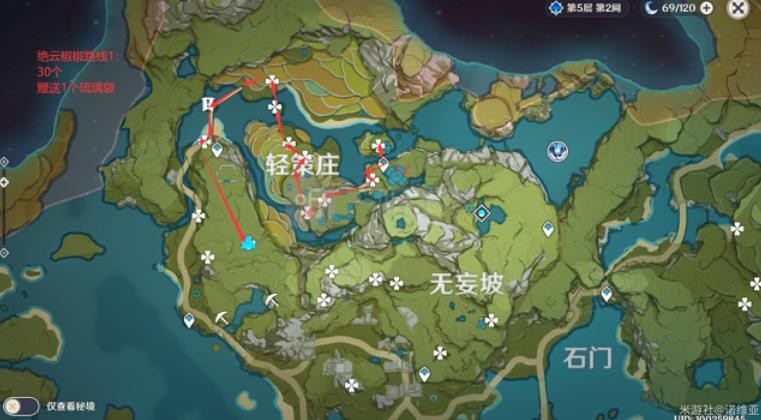 绝云椒椒在游戏中的任何地方都可以看到,首先我们可以来到轻策庄,这里的绝云椒椒分布还算密集,玩家能够在短时间内获得足够的绝云椒椒,具体的路线如下图所述,途中标记花朵的地方就是绝云椒椒的采摘地点。我们可以看到在轻策庄的周边都有着非常多的绝云椒椒。小编统计了一下,这里有着大概30个。