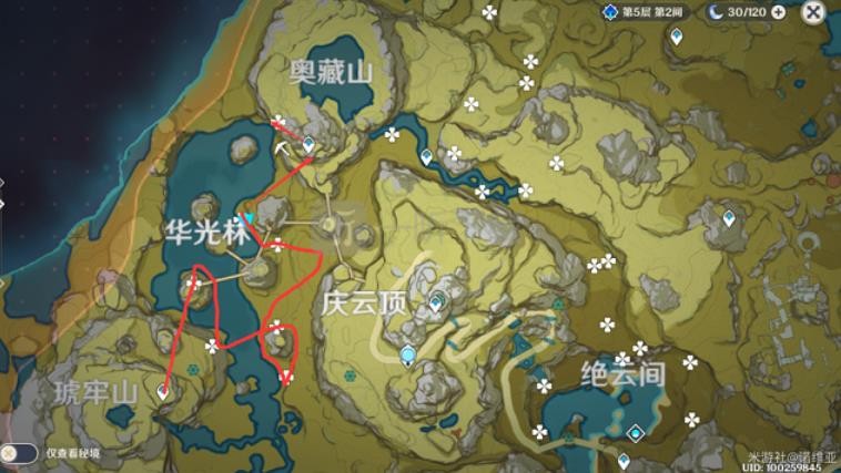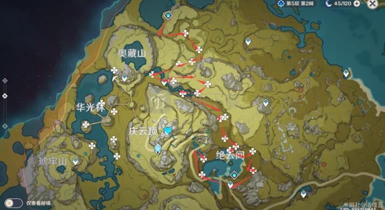 还有就是奥藏山的下方,这里的绝云椒椒虽然没有前面两个地方的多,也没有前两个地方的密集,但是我们也可以获得大概25个绝云椒椒,首先我们可以在下图中看到,在奥藏山西方的传送点有大概5个绝云椒椒,而且这里还有着矿产资源,玩家可以顺路收集,然后来到华光林右方的位置,在这里也有着10个左右的绝云椒椒,然后沿着途中红线的位置一直收集,能够收集到不少的绝云椒椒,当你收集完之后这些数量就够我们用一段时间了。