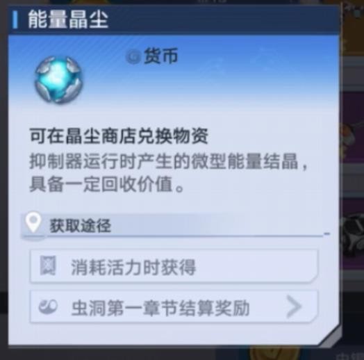 其中能量晶尘就是 消耗体力获得的附属产物,主要用于兑换源器碎片;