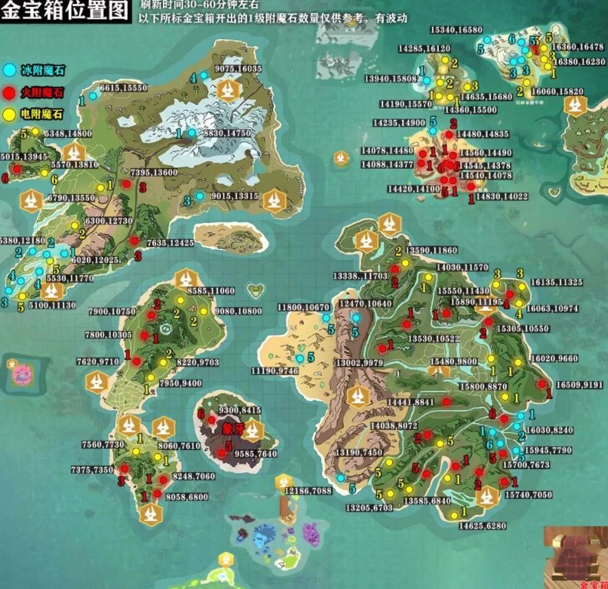 2、金宝箱刷新时间30-60分钟左右,以上所标金宝箱开出的1级附魔石数量仅供参考,有一定波动。