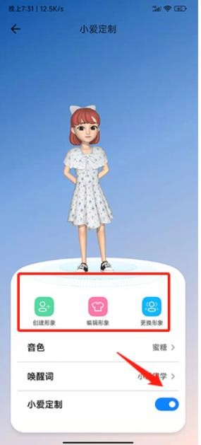 3、在定制形象的界面中,我们需要打开最下方的【小爱定制】功能按钮,然后点击上方的【创建形象】【编辑形象】【更换形象】就可以进行定制;