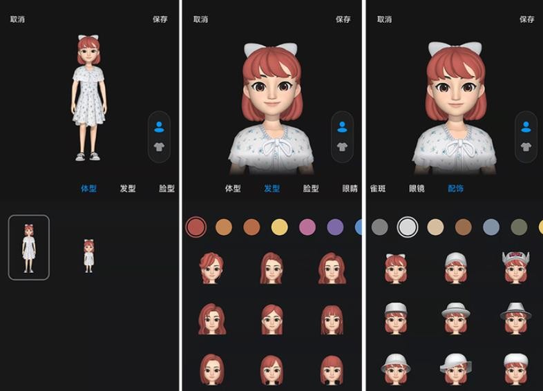 4、在人物生成页面中,可以选择不同的体型、发型、脸型、眼睛、还有雀斑、眼镜、配饰等,全部设置好后,就可以点击右上角的【保存】保存定制的形象。