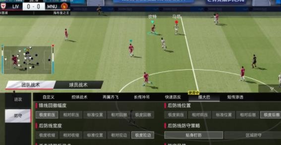 4、 团队战术:玩家可通过「团队战术」自由制定球队的整体进攻与防守战术,完成场上的宏观战术调整,当然也可直接选择现有的成套战术,如:两翼齐飞;快速防反等,并且支持在现有成套战术上进行细节微调。