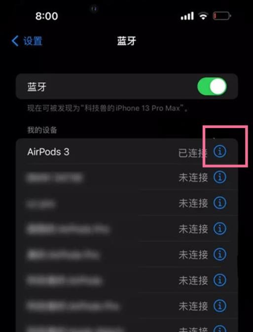 2、点击耳机名称右边的【i】图标进入耳机设置。