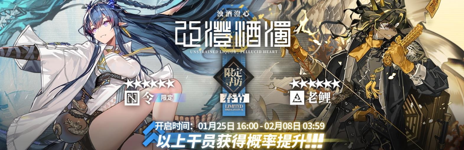 活动说明:活动期间【限定寻访·春节】-【浊酒澄心】寻访开启,该寻访中以下干员出现率上升