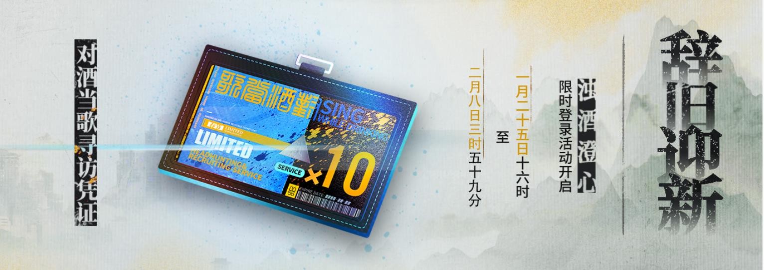 活动说明:玩家在活动期间进行登录即可在活动页面中领取登录奖励:[对酒当歌寻访凭证]*1