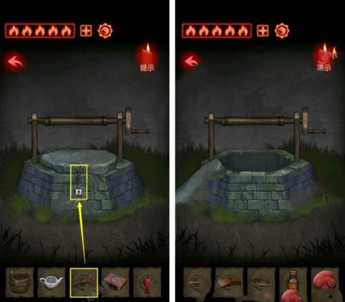 12、用【绳子】把【水桶】绑在辘轳上,转动把手,从井里打水,再用【茶壶】装水。