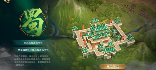 主要占据荆州、益州的大片富饶地域,以成都平原为政治军事中心。蜀国最擅长训练和使用步兵部队,秉信盾甲坚厚,循序渐进。