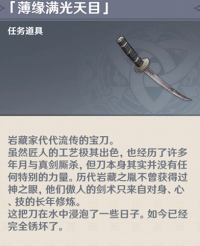 根据描述,这是一把岩藏家代代流传的宝刀,既然说到岩藏,不知道各位旅行者还记得我们早在2.0版本时解锁隐藏成就「岩藏武艺帐」时,最后供奉两把刀获得华丽宝箱的刀冢吗?不如我们过去看看。