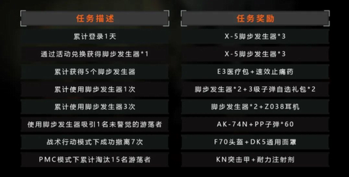 活动内容:先锋们进入活动中心【辨声行动】页面,累计登录1天就能领取脚步发生器,此外,随着先锋们在局内熟练使用脚步发生器,逐项完成挑战任务,即可获得枪械、子弹、盔甲、耐力注射剂等任务奖励。