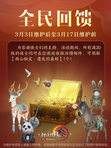 为了答谢侠士们一直以来的的理解与支持,3月3日维护后至3月17日维护前,所有满20级的侠士均可在信使处收取回馈邮件领取【西山秘宝·遗失的美好】1个!